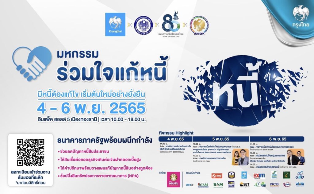 ธนาคารกรุงไทย ในฐานะธนาคารพาณิชย์ของรัฐ ตระหนักถึงผลกระทบจากสภาวะเศรษฐกิจไทยที่ฟื้นตัวแบบไม่ทั่วถึง รวมถึงปัญหาค่าครองชีพที่ปรับตัวสูงขึ้น ส่งผลกระทบต่อรายได้ ค่าใช้จ่าย และภาระหนี้สินของลูกค้า ทั้งนี้ เพื่อลดภาระทางการเงินให้กับลูกค้า และสนับสนุนการแก้ไขปัญหาหนี้ครัวเรือนของประเทศ ธนาคารได้เข้าร่วมงาน “มหกรรมร่วมใจแก้หนี้สัญจร : มีหนี้ต้องแก้ไข เริ่มต้นใหม่อย่างยั่งยืน” ภายใต้แนวคิด “ติดปีกการเงินไทย สู่ความยั่งยืน” โดยครั้งที่ 1 จัดขึ้นระหว่างวันที่ 4 – 6 พฤศจิกายน 2565 ณ ศูนย์การแสดงสินค้าและการประชุม อิมแพค เมืองทองธานี อาคาร 5 และจัดอย่างต่อเนื่องใน 4 ภูมิภาค ทั่วประเทศ ครั้งที่ 2 จังหวัดขอนแก่น ระหว่างวันที่ 18 – 20 พฤศจิกายน 2565 ครั้งที่ 3 จังหวัดเชียงใหม่ ระหว่างวันที่ 16 – 18 ธันวาคม 2565 ครั้งที่ 4 จังหวัดชลบุรี ระหว่างวันที่ 20 – 22 มกราคม 2566 และครั้งที่ 5 จังหวัดสงขลา ระหว่างวันที่ 27 – 29 มกราคม 2566 จังหวัดสงขลา