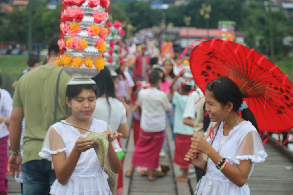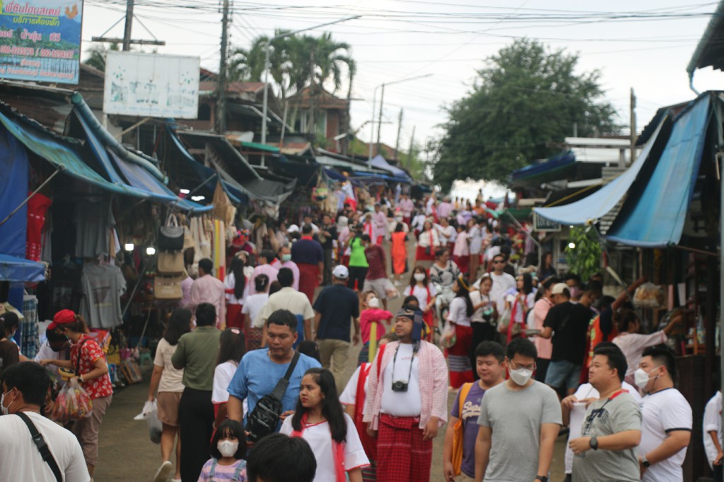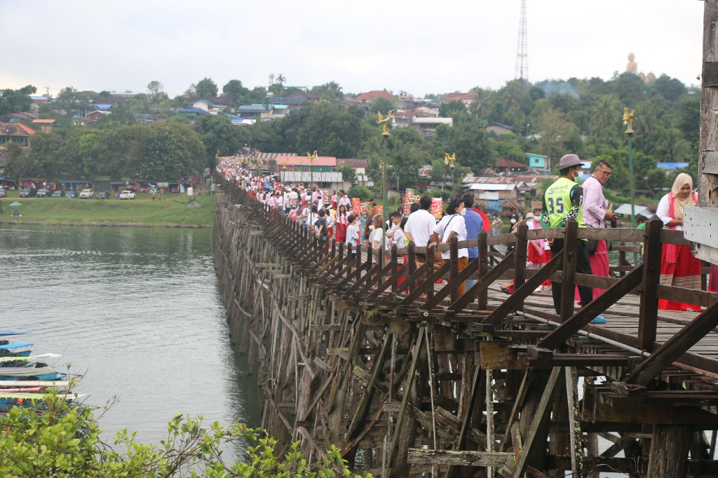 ที่ชุมชนชาวมอญบ้านวังกะ ต.หนองลู อ.สังขละบุรี จ.กาญจนบุรี เต็มไปด้วยนักท่องเที่ยวที่เดินทางมาร่วมทำบุญตักบาตรตั้งแต่เช้าตรู่ เพื่อความเป็นสิริมงคล โดยนักท่องเที่ยวส่วนใหญ่เลือกสวมใส่ชุดพื้นเมือง สีสันสวยงาม เพื่อถ่ายภาพเก็บไว้เป็นที่ระลึก ก่อนจะเดินลงไปชมบรรยากาศบนสะพานอุตตมานุสรณ์ หรือสะพายมอญ ซึ่งเป็นสะพานไม้ที่ยาวที่สุดในประเทศไทย ท่ามกลางอากาศยามเช้าที่เย็นสบาย พร้อมทั้งใช้บริการประแป้งทานาคา และเลือกซื้อดอกไม้เพื่อนำไปไหว้พระที่เมืองบาดาล ที่เด็กๆ ชาวมอญ กะเหรี่ยง นำมาบริการนักท่องเที่ยวบนสะพาน ส่งผลให้บนสะพานมอญเต็มไปด้วยนักท่องเที่ยว