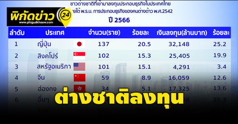 กรมพัฒนาธุรกิจการค้า เผย ปี 2566 ต่างชาติลงทุนในไทย 127,532 ล้าน ญี่ปุ่นลงทุนอันดับหนึ่ง 32,148 ล้าน ตามด้วย สิงคโปร์ 25,405 ล้าน และฮ่องกง 17,325 ล้าน จ้างงานคนไทย 6,845 คน